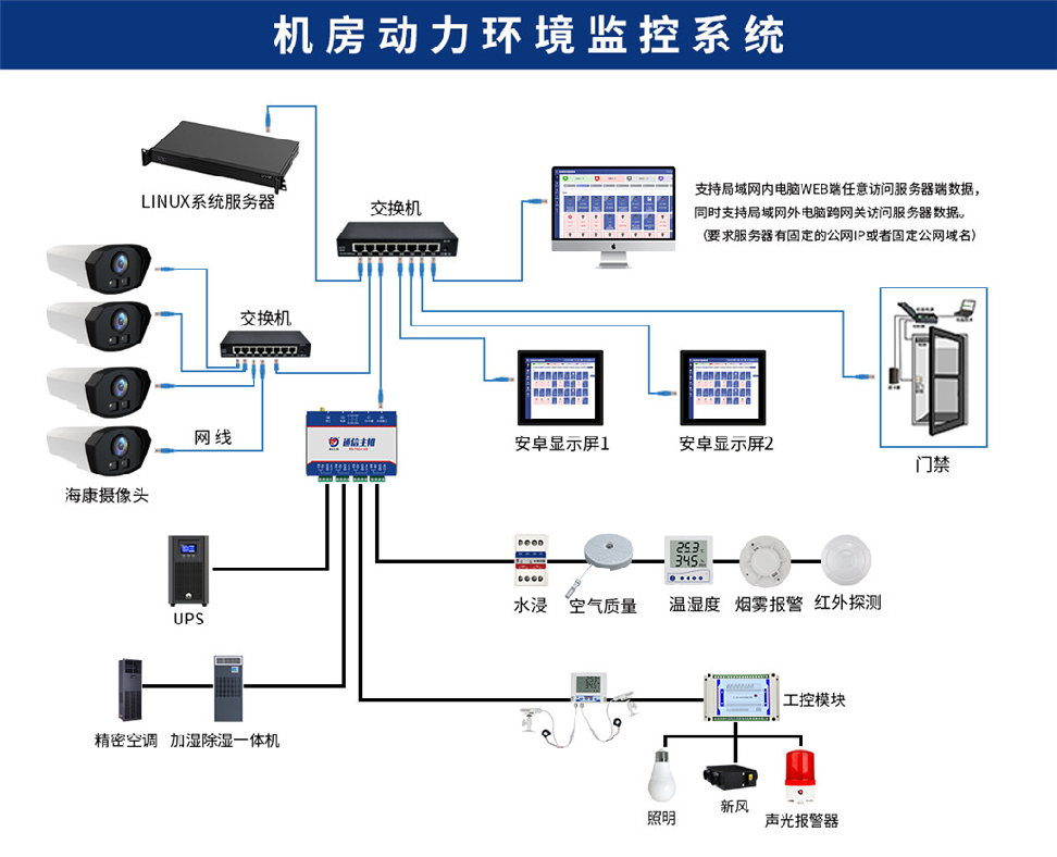 ● 采集機(jī)房?jī)?nèi)的溫濕度數(shù)據(jù),同時(shí)將數(shù)據(jù)上傳至監(jiān)控平臺(tái),并可以根據(jù)設(shè)定的溫濕度要求打開(kāi)或關(guān)閉空調(diào)、除濕機(jī)、加濕機(jī)等設(shè)備,實(shí)現(xiàn)對(duì)溫濕度的管控。