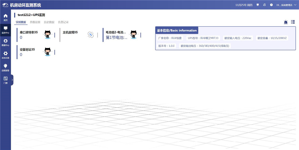 UPS監(jiān)測(cè)頁(yè)面分為設(shè)備狀態(tài)列表、參數(shù)設(shè)置、歷史數(shù)據(jù)查詢/曲線查看、告警記錄四部分